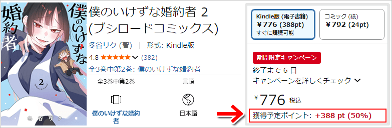 例えば、776円の対象Kindle本を購入すると、50%となる388ポイントが還元されるという非常にお得なキャンペーンとなっています。
