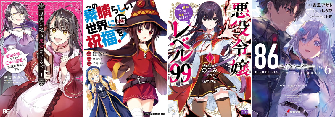 有名どころだと『悪役令嬢レベル99』『魔術師クノンは見えている』『異世界食堂』『佐々木とピーちゃん』『このすば』『86』『歴史に残る悪女になるぞ』『Re:ゼロ』などなど、さまざまな作品が登場しています。
