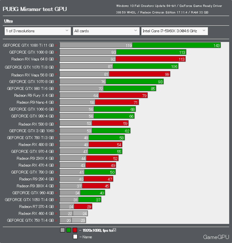 1920 x 1080最高設定でMin60fpsターゲットならGTX 1070(FHD@Min76fps)があれば十分快適に遊べます。より高フレームレートを目指すなら、予算の許すかぎりGTX 1080(FHD@Min93fps)やGTX 1080 Ti(FHD@Min119fps)などの上位製品を狙いたいところです。