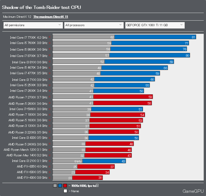 1080p最高設定でのMin 60 fpsターゲットだと、GTX 1070 8GB以上で快適にプレイができます。DirectX 12と11ではフレームレートにかなりの差が出ているため、Windows10ユーザーはDirectX 12でプレイした方が良さそうです。