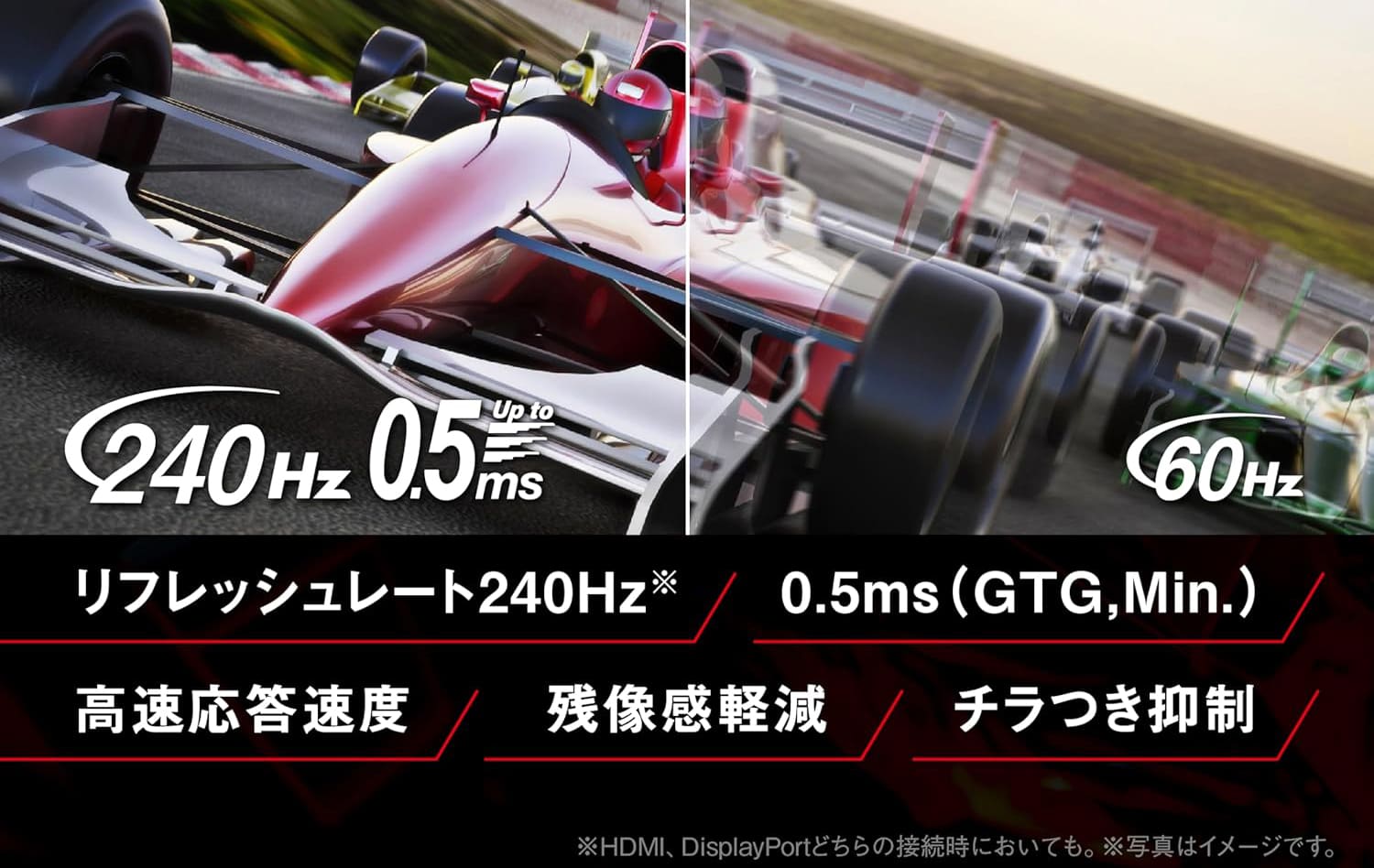 240Hzの高リフレッシュレートと、広視野角・高発色を実現するIPSパネルを採用。さらに、0.5ms (GTG, Min)の高速応答速度により、残像感やブレを抑え、動きの速いゲームも滑らかにプレイできることを特徴とし、FPSやアクションゲーム、格闘ゲーム等のPCゲーミングに最適とされています。