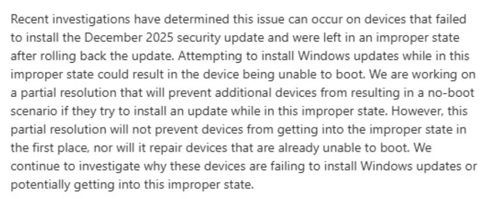 Microsoftによると、2026年1月のWindows Updateをインストール後、Windows11が起動不能になる不具合は、商用PC / 業務用PC (Commercial PC)に限定されているという。 2025年12月の更新プログラムが正常にインストールされず、PCが「不適切な状態」になったことが原因とされている。Microsoftはなぜこのような状態になったのか調査中だという。 以下はMicrosoftがIT管理者に宛てたメッセージだ。