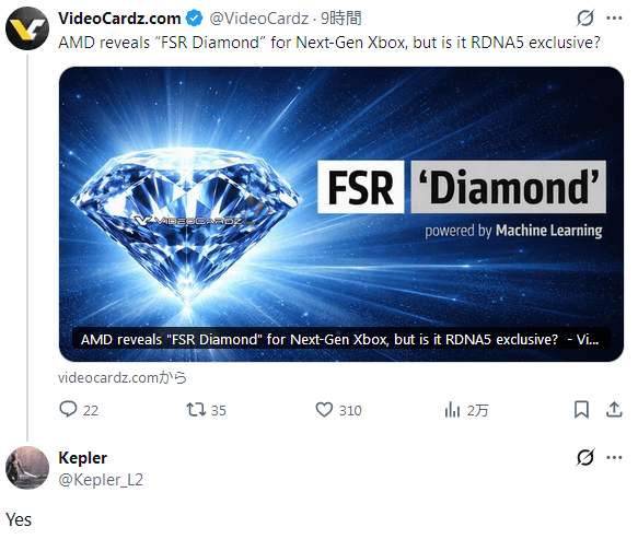 VideoCardz: AMDがFSR Diamondを発表しましたが、これはRDNA 5専用になるのでしょうか? Kepler: はい。 |