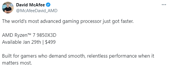 そして今回、米AMDのDavid McAfee氏がX (旧Twitter)にて、Ryzen 7 9850X3Dの希望小売価格(MSRP)および発売日を発表しました。