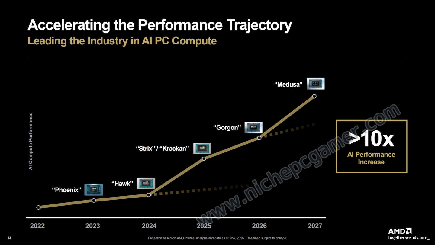 当社(AMD)は、2024年以降、AI PCポートフォリオを2.5倍に拡大し、Ryzenシリーズは現在ノートPCとデスクトップを合わせて250を超えるプラットフォームを支えています。 当社はクライアント向けプロセッサーのロードマップに関する新たな情報を公開いたしました。AI PCは次世代の『Gorgon』と『Medusa』プロセッサーによって、AIパフォーマンスの転換点を迎えます。 初代Ryzen AIから2027年登場予定の『Medusa』ファミリーにかけて、10倍以上の性能向上が見込まれています。 ― AMD |