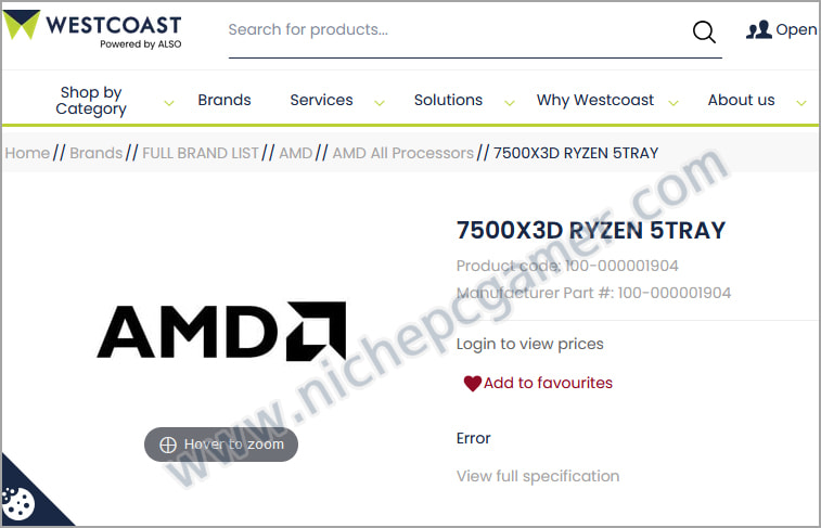 AMDからRyzen 5 7500X3Dに関する発表はまだありませんが、英国のPC関連製品卸売企業Westcoast LimitedのWebサイトに掲載されました。それがこちら。