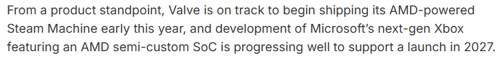 製品面では、ValveはAMD製CPUを搭載したSteam Machineを2026年の早い段階(Early this year)で発売する予定。 また、AMDのセミカスタムSoCを採用したMicrosoftの次世代Xboxの開発も順調に進んでおり、2027年の発売をサポートする体制が整っています。 ― AMD CEO, Lisa Su |