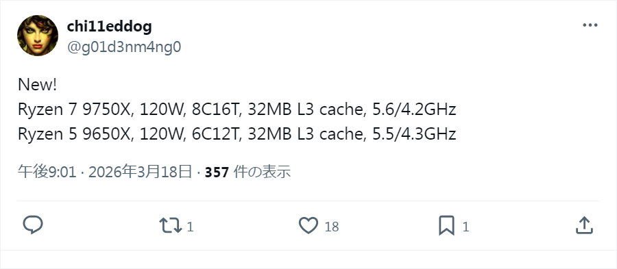 chi11eddog氏によると、AMDは新たに8C16T / ベース4.2GHz / ブースト5.6GHzのRyzen 7 9750Xと、6C12T / ベース4.3GHz / ブースト5.5GHzのRyzen 5 9650Xを投入するとのこと。これらのCPUは、Ryzen 7 9700X、Ryzen 5 9650Xの上位モデルという位置付けになります。