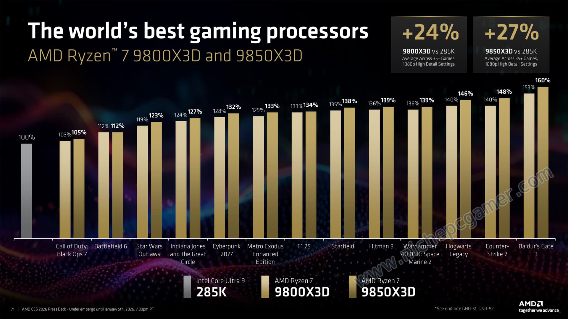 AMDによると、35タイトル以上のゲームでベンチマークを行ったところ、Ryzen 7 9850X3Dは、Intelの現行最上位CPUであるCore Ultra 9 285Kよりも平均27%も高いゲーム性能を有するとのこと。