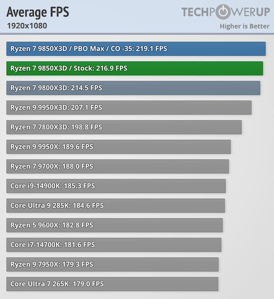 Ryzen 7 9850X3D | 15タイトルゲームベンチマーク平均: 216.9 fps
