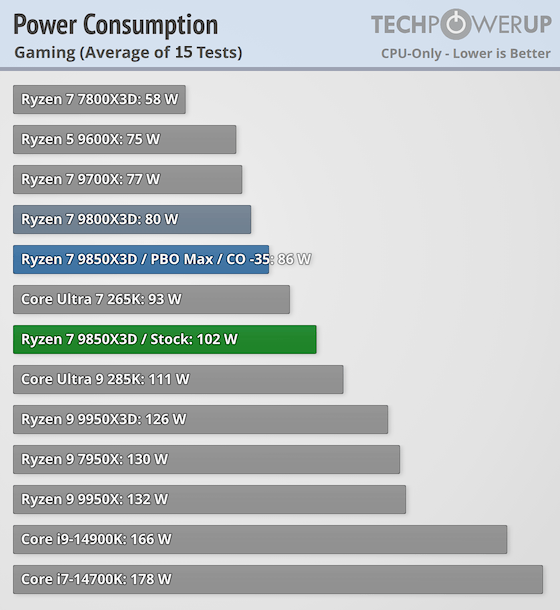 Ryzen 7 9850X3Dの平均消費電力は102W。性能が向上した分、Ryzen 7 9800X3D (80W)から22W、消費電力が上がっています。