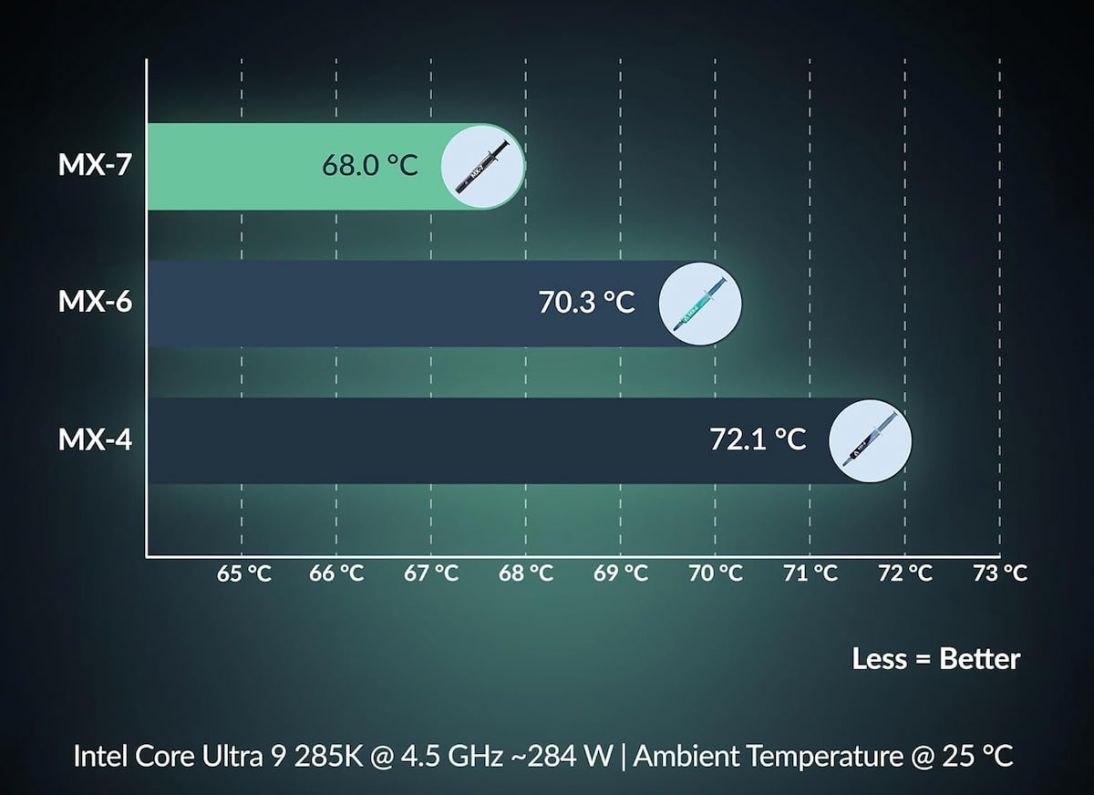 Core Ultra 9 285K@4.5GHzの高負荷環境で検証したところ、MX-7は、MX-6よりも2.3℃、MX-4よりも4.1℃低い温度を示しました。