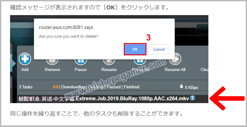 ASUSはDownload Masterの使い方を説明するために、779.92MBと1.98GBと2.53GBの何らかの動画ファイルを3つダウンロードしています。ファイル名は白線で消されていますが、一番下の画像はファイル名を消し忘れています。ASUSがダウンロードしていたファイルの1つは『极限职业.英语.中文字幕.Extreme.Job.2019.BluRay.1080p.AAC.x264.mkv』です。