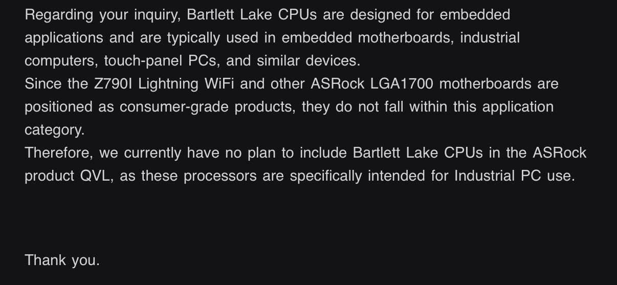 RedditユーザーがASRockにZ790I Lightning WiFiでBartlett Lake-Sが動作するか問い合わせたところ、以下の返信が来ました。