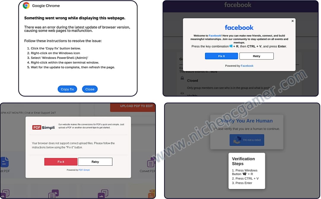 ClickFix攻撃とは、悪意のあるWebサイト(例えば、偽の企業サイトや偽のSNSサイトなど)を訪れたユーザーのクリップボードに、マルウェアをダウンロードしたり実行するコードを仕込み、以下のような手順を行わせる手口。