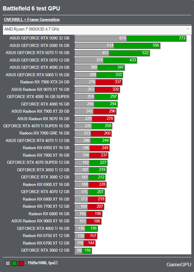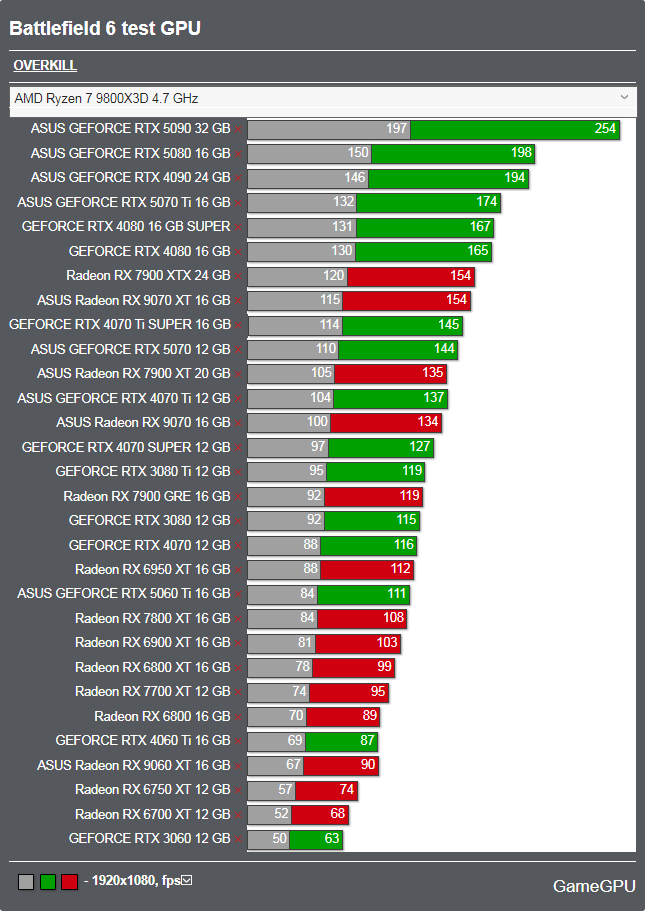 上記シーンをネイティブ画質の1920 x 1080最高設定でMin 60 fpsを保つには、GeForce RTX 4060 Ti 16GB(Min 69 fps) / Radeon RX 9060 XT 16GB(Min 67 fps)以上で可能となっています。