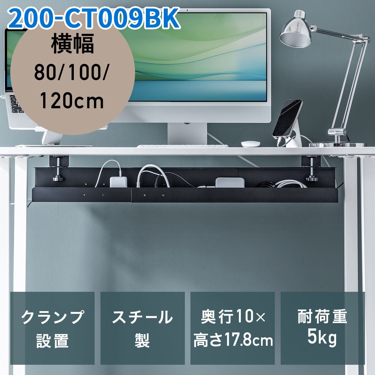 本製品はPCデスク向けのケーブルトレー。クランプ式でデスクに簡単に後付けができ、電源タップや邪魔なケーブルをスッキリと収納・目隠しができます。本体はスチール製のため、マグネット製品の取り付けも可能です。