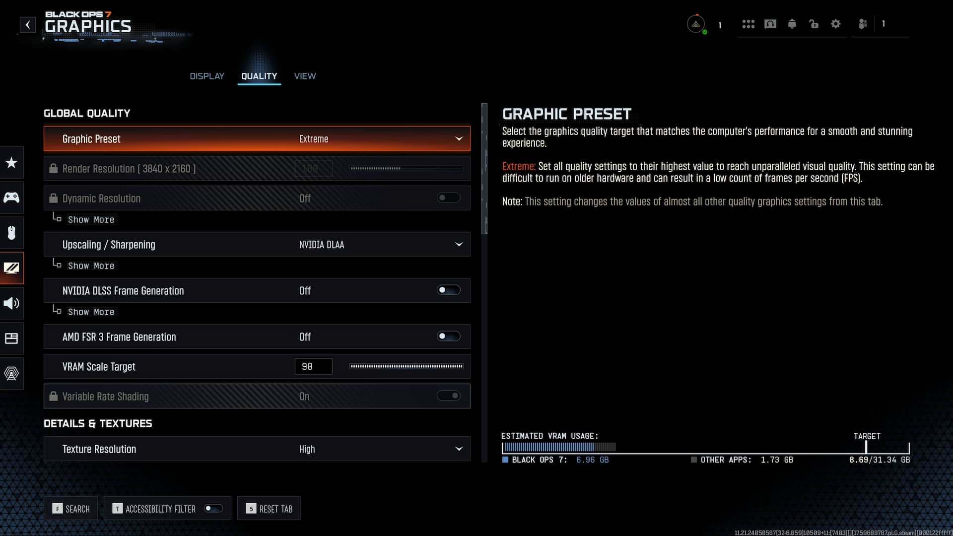 アップスケーリングはNVIDIA GeForceがDLAA、AMD RadeonがFSR 3のネイティブです。フレーム生成(Frame Generation)やマルチフレーム生成(Multi Frame Generation)は無効です。その他、各種設定は最高設定です。