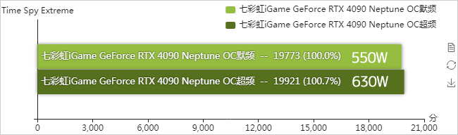 550Wでもかなりの消費電力ですが、630Wにするとどれほどのパフォーマンスアップが得られるのでしょうか。3DMark Time Spy Extreme (TSE)比で以下のようになりました。