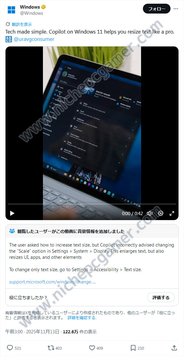 MicrosoftがX (旧Twitter)にて「テクノロジーをもっとシンプルに。Windows11のCopilotが、プロのように文字サイズを調整する手助けをします」との謳い文句で公開したCopilotの宣伝動画がこちら。