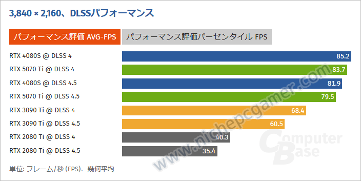 GeForce RTX 5070 Tiは、DLSS 4.0 Super Resolutionだと83.7 fpsですが、DLSS 4.5 Super Resolutionだと79.5 fpsと、上述の通り約5%フレームレートが低下しています。GeForce RTX 4080 SUPERも同様に約4%低下しています。