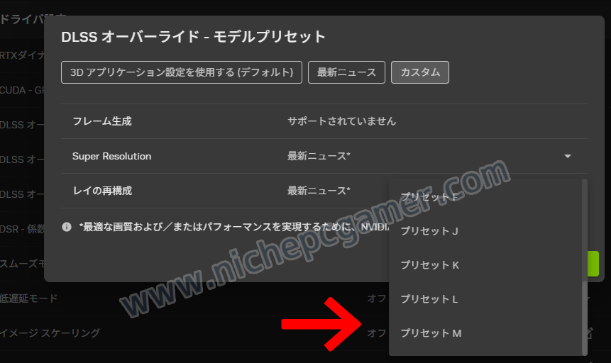 プリセットMとプリセットLはDLSS 4.5 Super Resolutionです。プリセットMはすべての解像度に適したパフォーマンス設定で上述した『最新ニュース』設定と同じです。(つまりデフォルト設定です) プリセットLは4K解像度向けのウルトラパフォーマンス設定です。