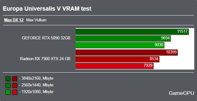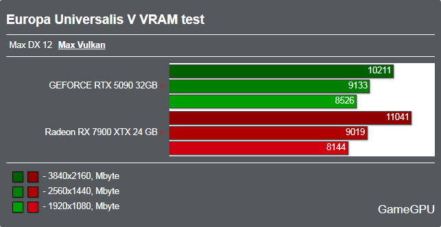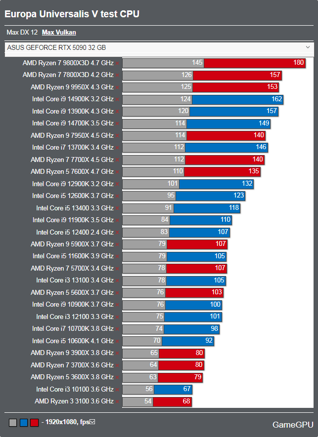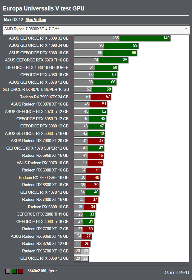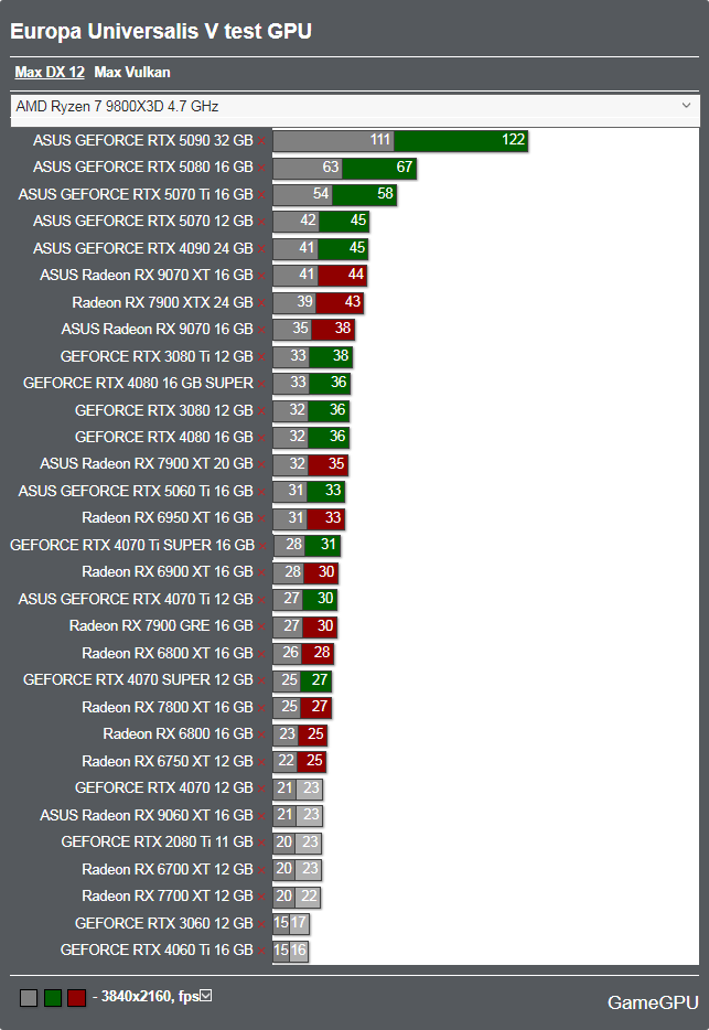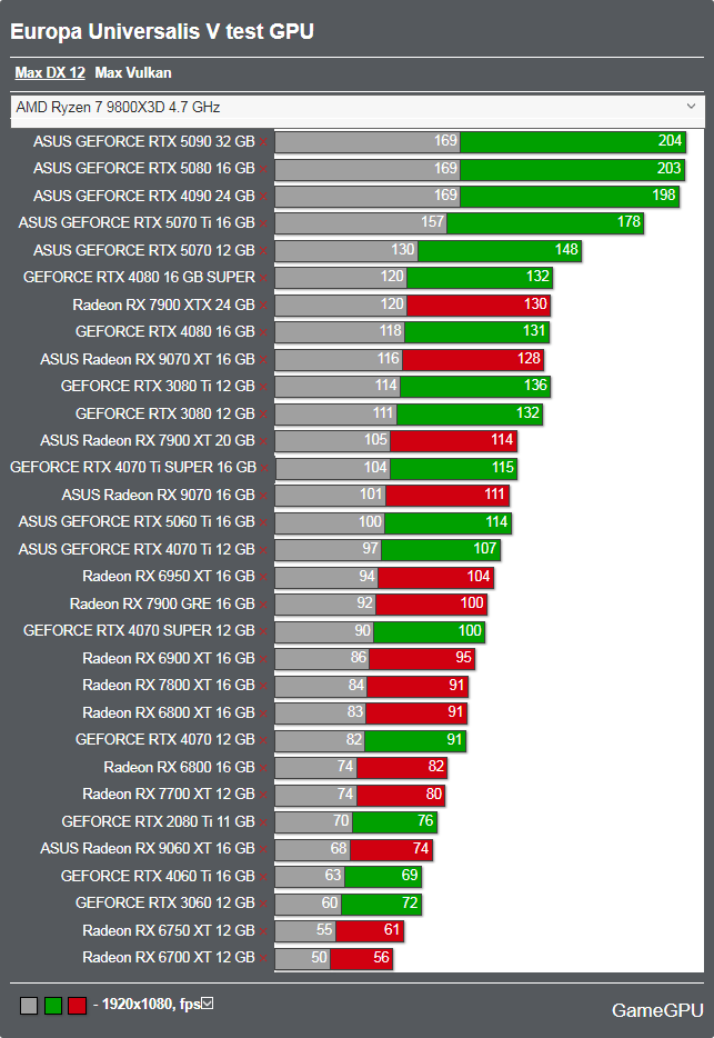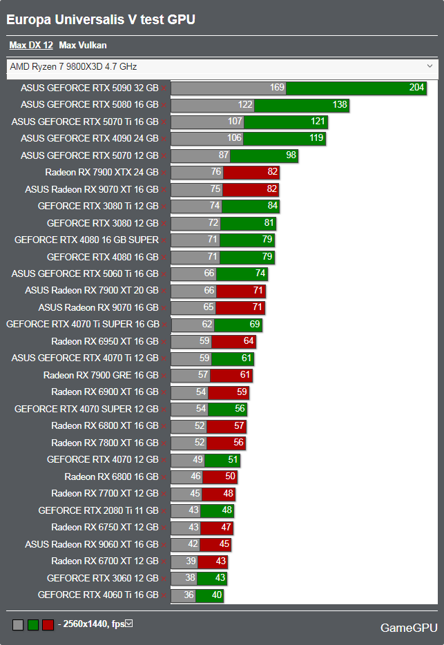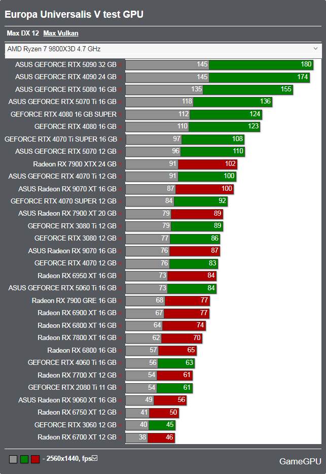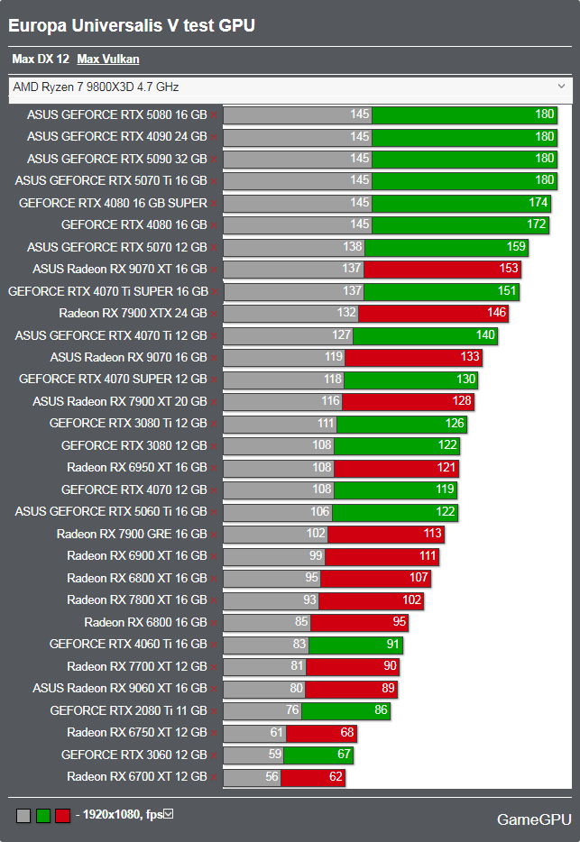 『Europa Universalis V』はDirectX 12とVulkan APIに対応しており、使用するグラボや解像度によって各APIでフレームレートが結構変わってきます。1080pを例に挙げると、GeForce RTX 5090やGeForce RTX 5080といったハイエンドグラボはDirectX 12の方が高フレームレートが出ます。一方で、GeForce RTX 5060 Ti 16GBやGeForce RTX 5070はVulkanの方が高フレームレートが出ます。