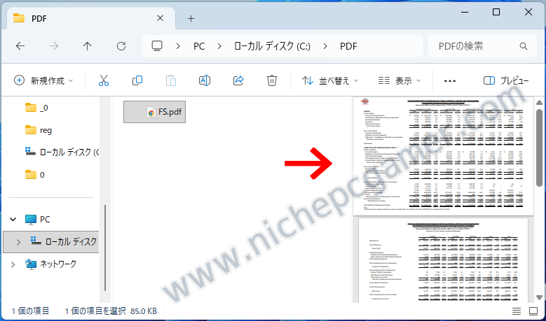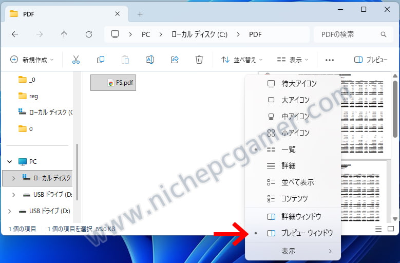 この機能を有効にすると、ファイルエクスプローラー上でPDFファイル(.pdf)や画像ファイルなどを選択すれば、右側のペインに以下のようにファイルの中身がプレビュー表示されます。
