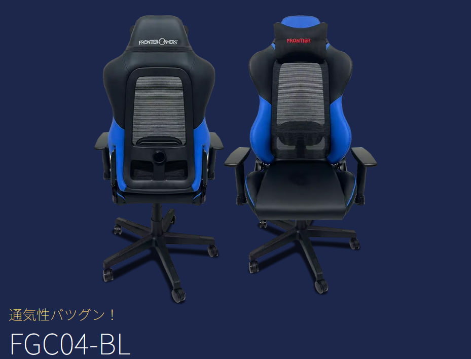『FGC04-BL』は、体温や湿気を効率的に逃がし、暑い日でも常にドライで快適な座り心地を維持できることが特長のゲーミングチェア。人間工学に基づいたバケットシート形状により、スポーツカーに乗っているかのように、身体を深く支えることができます。