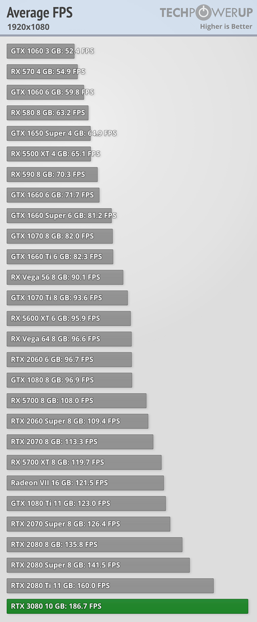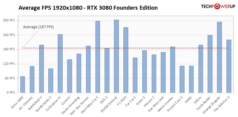 DOOM Eternalのプレイ動画でわかってはいましたが、ぶっちぎりのゲームパフォーマンスを見せています。特に解像度が高くなるごとにその差は如実に表れて、RTX 2080 Tiと比較すると、RTX 3080は、1080pで16.8%、1440pで24.5%、4Kで31.7%高い平均フレームレートとなっています。