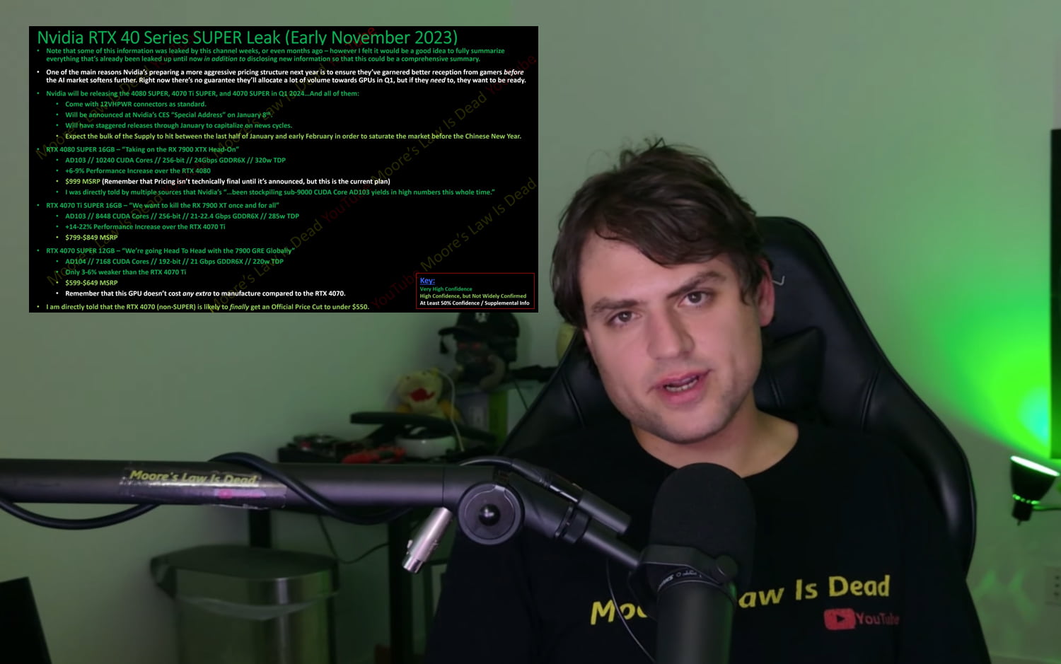 GeForce RTX 4000 SUPERシリーズのおおよその希望小売価格価格と性能がリークされました。YouTubeチャンネルのMoore’s Law Is Deadが報じました。