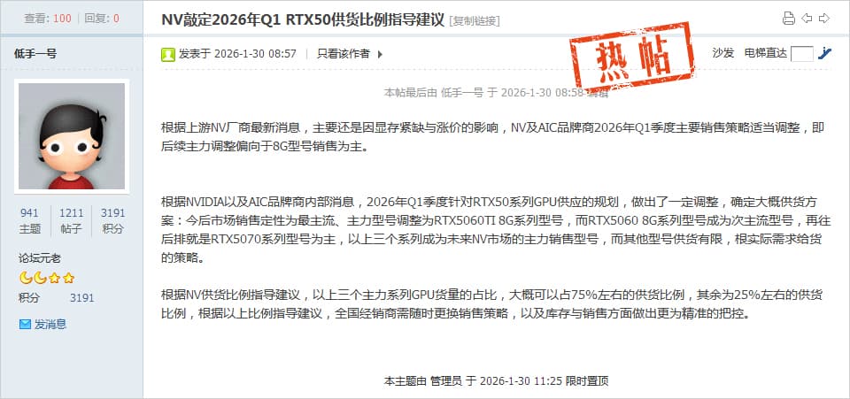 ▼NVIDIA、2026年第1四半期(1~3月)のGeForce RTX 5000シリーズの出荷比率ガイドラインを確定 NVIDIAは、ビデオメモリ(VRAM)の不足と価格上昇の影響により、2026年第1四半期のGeForce RTX 5000シリーズGPUの出荷比率の調整し、8GBモデルに重点を置く予定だ。 私がNVIDIAおよびAICパートナー(NVIDIA製GPUを扱うグラボメーカー)から得た内部情報によると、市場での主力モデルはGeForce RTX 5060 Ti 8GBとし、次点でGeForce RTX 5060 8GB、3番目にGeForce RTX 5070 12GBとなり、これら3モデルが今後の主力製品となる。 NVIDIAの出荷比率ガイドラインによると、この3つがGeForce RTX 5000シリーズ全体出荷量の約75%を占め、残りの約25%がその他のモデルに割り当てられる見通しだ。 その他のモデルは出荷量が限られているため、需要に応じて出荷量が調整されることになる。 |