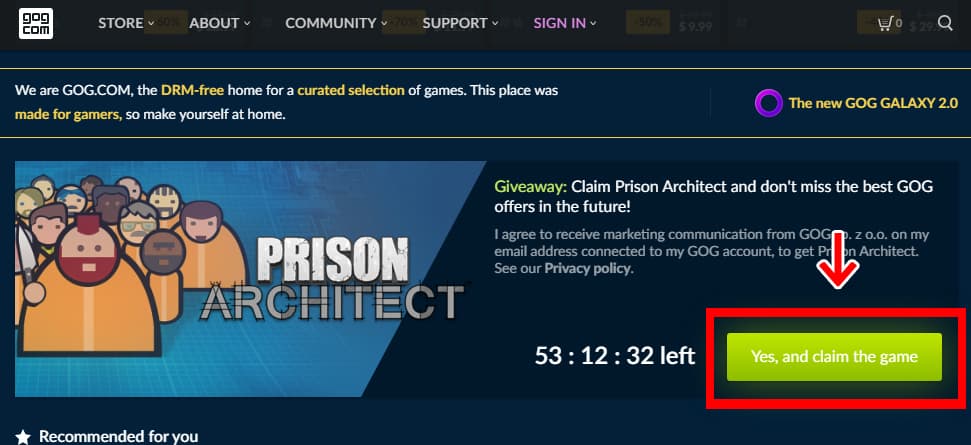 GOGトップページを開くと、ちょっと下に『Prison Architect』のバナーがあります。GOGから送信されるニュースメール等の受け取りに同意できる場合は『Yes, and claim the game』をクリックすれば無料で入手できます。