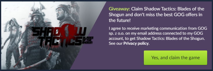 GOGトップページを開くと、ちょっと下に『Shadow Tactics: Blades of the Shogun』のバナーがあります。GOGから送信されるニュースメール等の受け取りに同意できる場合は『Yes, and claim the game』をクリックすれば無料で入手できます。