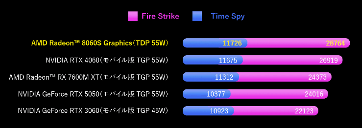 そのグラフィック性能は、同TDPだとGeForce RTX 4060 Laptop GPUをも凌駕します。