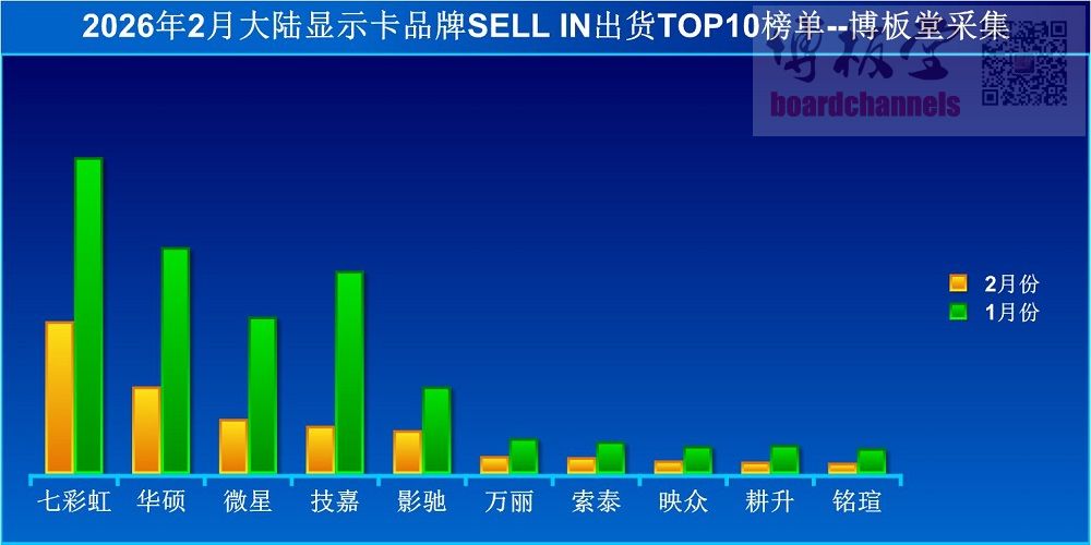 グラフィックスカード(以下、グラボ)の出荷量が一気に半減した。 2026年2月の中国市場におけるすべてのグラボメーカーの総出荷量は、2026年1月と比較して約59%減、1年前の2025年2月と比較すると約42%減となった。 2026年2月はどのグラボメーカーも前月比・前年比ともに出荷量が大きく落ち込み、販売状況も良いとは言えなかった。加えて、1月に出荷が集中し、2月は出荷期間自体が短かった。(※筆者注: 出荷期間が短いのはおそらく旧正月の影響) 各グラボメーカーの2026年2月のグラボ出荷量トップ10は以下の通りだ。