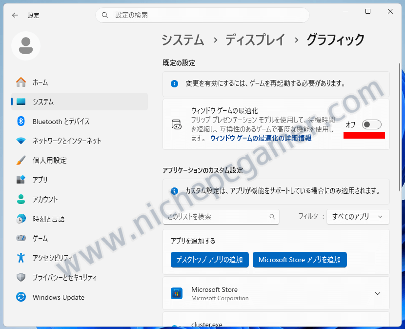 『設定』 → 『システム』 → 『ディスプレイ』 → 『グラフィック』へと進んで『ウィンドウ ゲームの最適化』のトグルを『オン』から『オフ』へと変更してください。