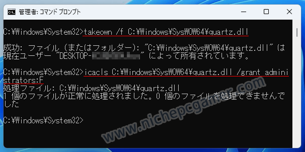 これで『quartz.dll』を上書きできるようになりました。上記のバージョン10.0.26100.3912の『quartz.dll』へと上書きしてください。上書き時に『管理者の権限が必要です』と表示されたら『続行』を選択してください。