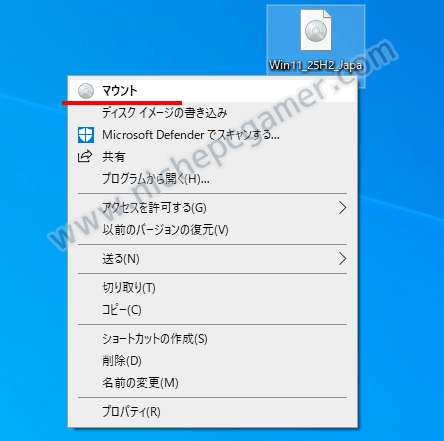 Windows11のISOファイルをダウンロードしたら、ISOファイルを右クリックして『マウント』を選択してください。