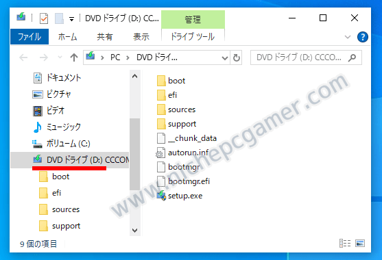 するとISOファイルがDVDドライブとしてマウントされます。このマウントされたドライブを覚えておいてください。以下の画像の例だと『D:』(Dドライブ)です。