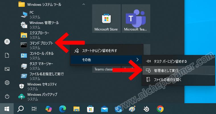 『スタートボタン』 → 『Windows システム ツール』と進み、『コマンド プロンプト』を右クリックして『その他』 → 『管理者として実行』を選択してください。