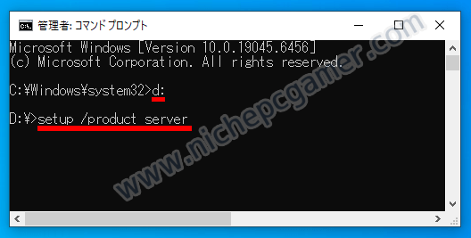 コマンドプロンプトが起動したら、『4.)』でISOファイルがマウントされたドライブを入力してエンターを押してください。『4.)』の例だと、『d:』と入力してエンターです。次に『setup /product server』と入力してエンターを押してください。これがシステム要件の確認をバイパスするための裏技コマンドです。