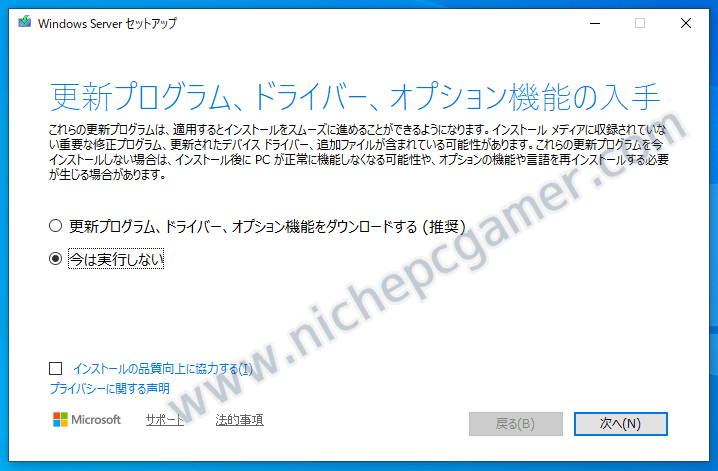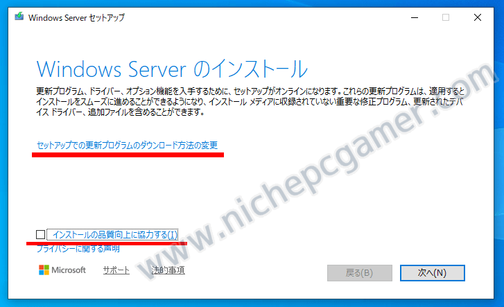『インストールの品質向上に協力する』のチェックはお好みでチェックを外すなりしてください。その後、『セットアップでの更新プログラムのダウンロード方法の変更』を選択してください。