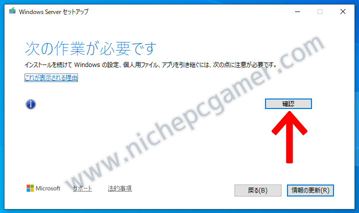 環境によっては『次の作業が必要です』と表示される場合があります。その際は『確認』を押してください。『確認』を押せば次に進みます。