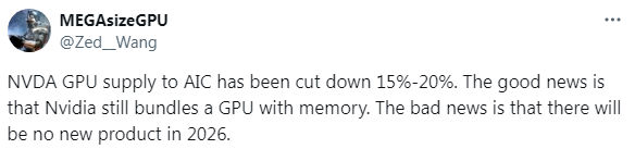 NVIDIAはAICパートナー(グラボメーカー)へのGPU出荷量を15~20%減らしました。 良いニュースとしては、NVIDIAは引き続きGPUとVRAMをセットで(グラボメーカーに対して)出荷しているということです。 悪いニュースとしては、2026年には新製品は発売されないということです。 |