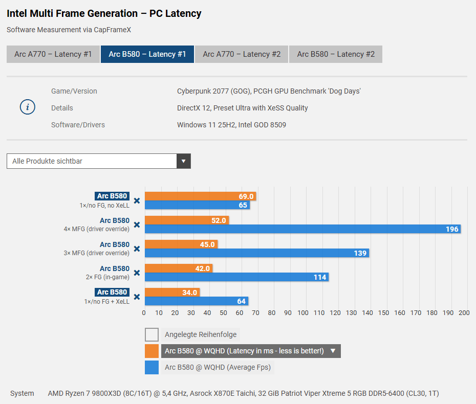 さらに注目点はレイテンシー(Latency / 遅延)です。(オレンジのバー) Intel ArcシリーズにはXeLLと呼ばれる入力遅延を減らすための機能があります。(NVIDIA GeForceで言うところのReflexや、AMD Radeonで言うところのAnti-Lag 2に類する機能)