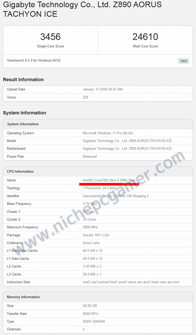 Arrow Lake RefreshデスクトップCPUとなる、Intel Core Ultra 9 290K PlusがGeekbenchに掲載されました。そのベンチマーク結果がこちら。