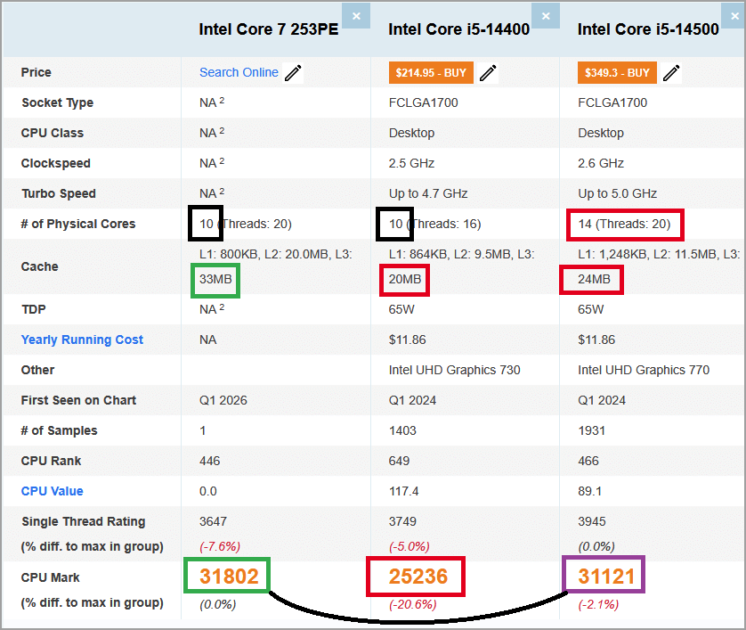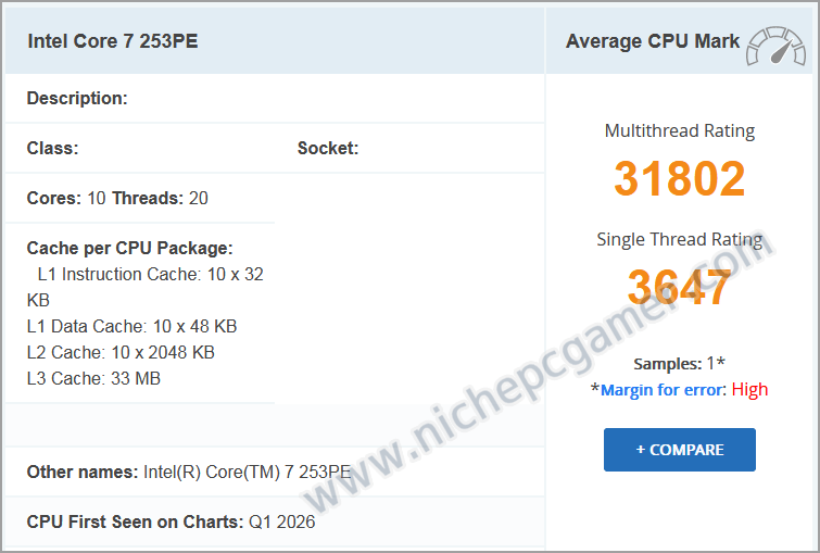 10P-CoreのIntel CPU、Core 7 253PEが登場!Bartlett Lakeか。PassMarkに掲載。ベンチマーク結果は
