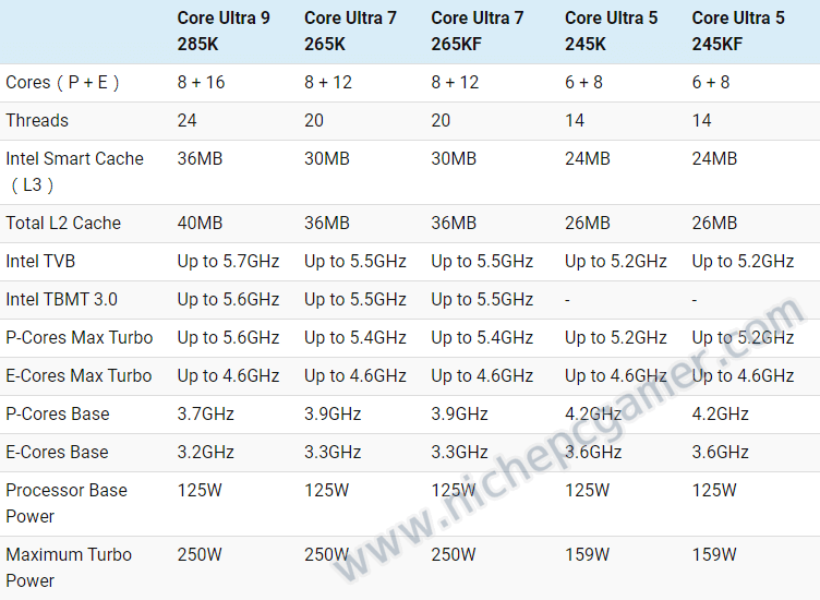 Arrow LakeデスクトップCPU、K付きモデルの最終スペックが判明。Core Ultra 9 285K、Core Ultra 7 265K、Core Ultra 5 245Kなど
