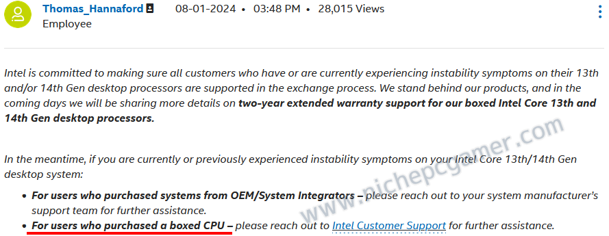 2024年7月26日時点では、トレイ版のCPUで不具合が発生した場合、Intelに連絡するよう案内しています。
